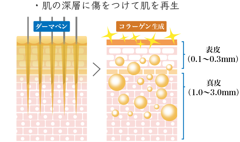 ニキビ跡は、肌の深層(~3mm)に生じてる症状なので、深層から治療しないと有効な改善はできません。